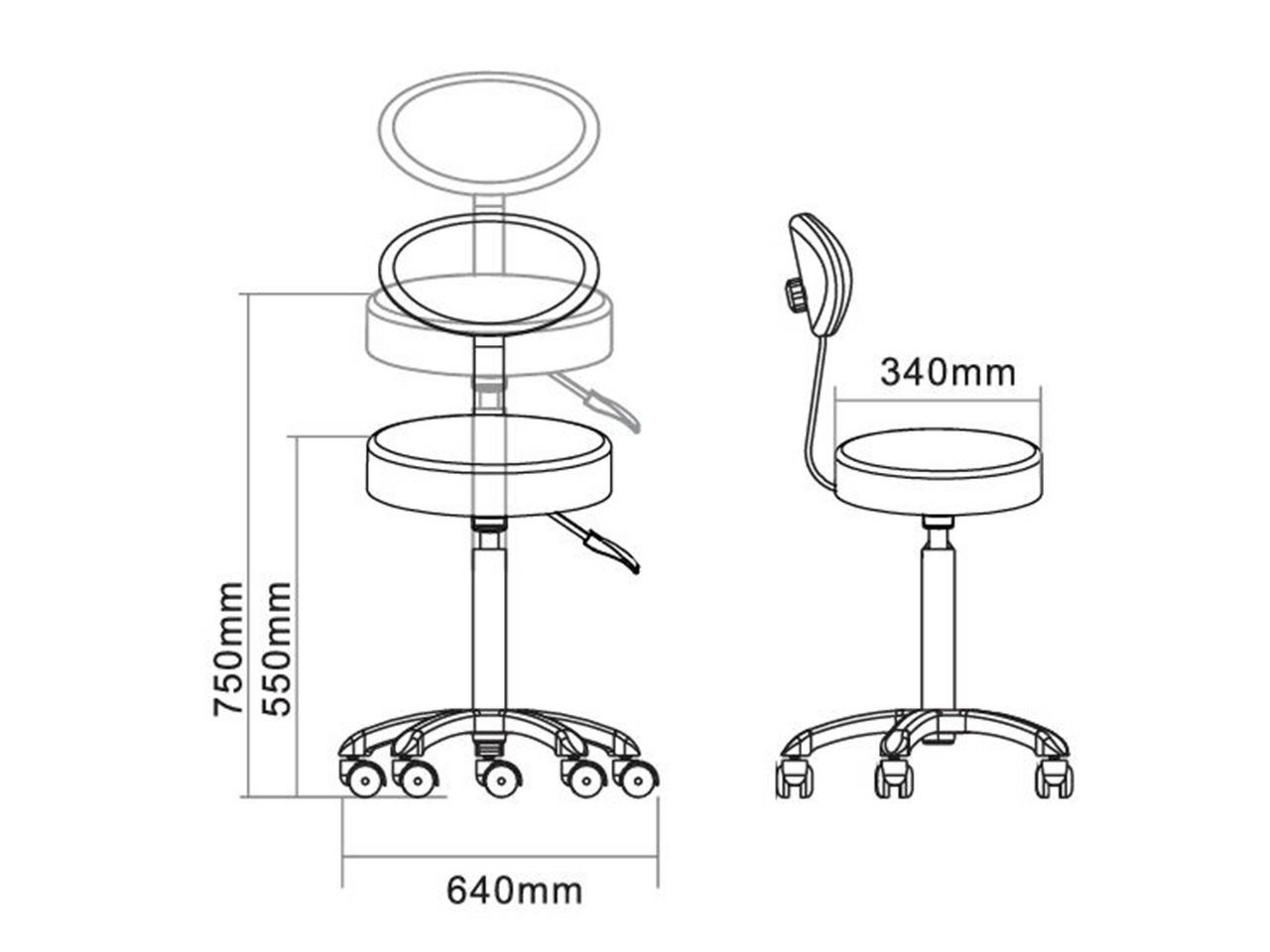 • Materijal: postolje od inoksa s kotačima i podstavljena stolica s naslonom za leđa presvučena umjetnom kožom
