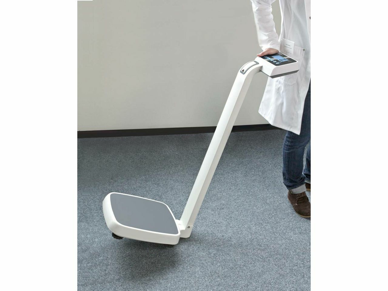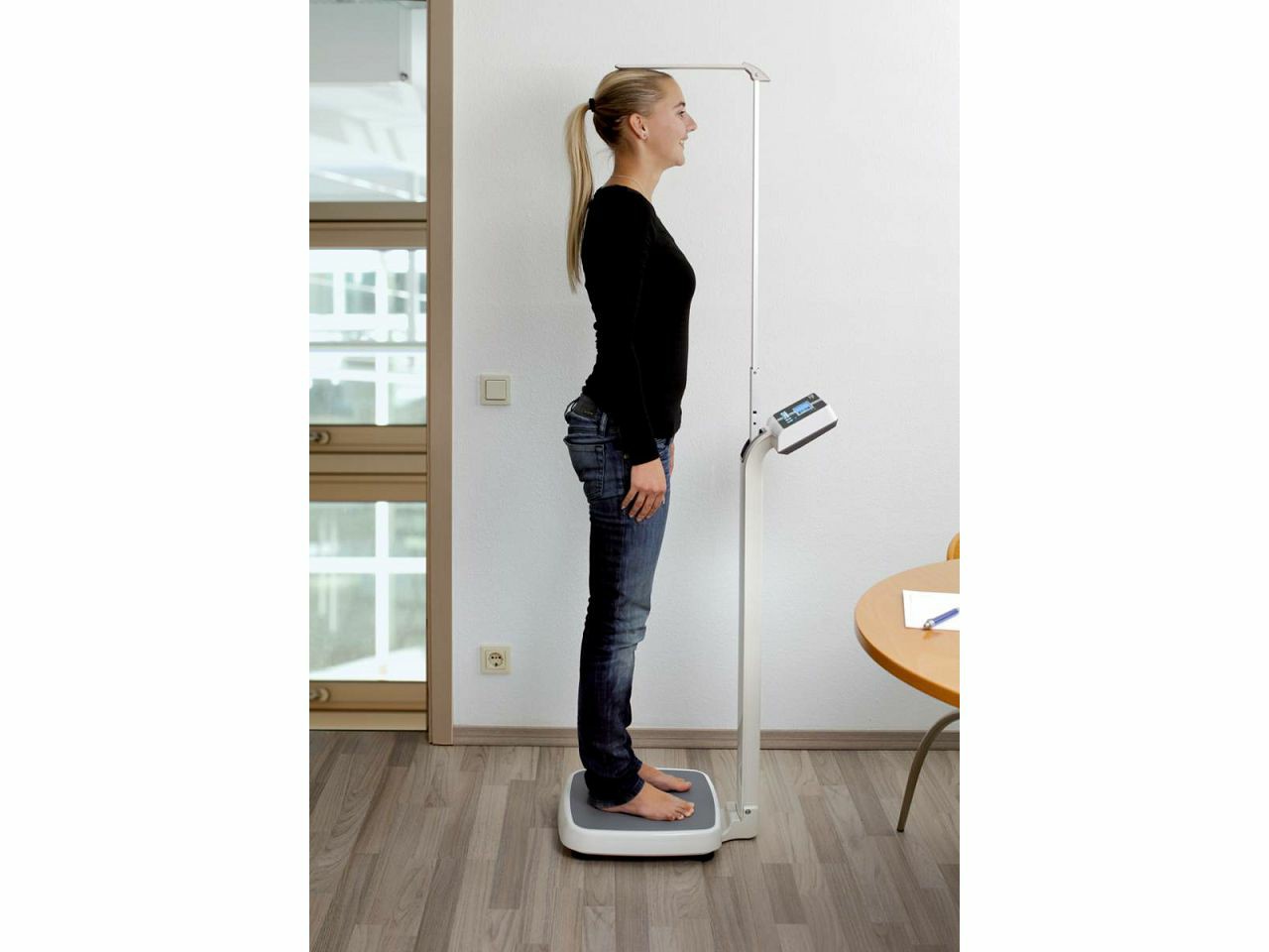 Niska platformska vaga sa čvrstim rukohvatom za dodatnu stabilnost pacijenta. Vaga može izvagati do 300 kg i nudi podršku pacijentima s invaliditetom. Visinomjer za mjerenje do 210 cm visine sastavni je dio ove višenamjenske vage. Dva transportna kot